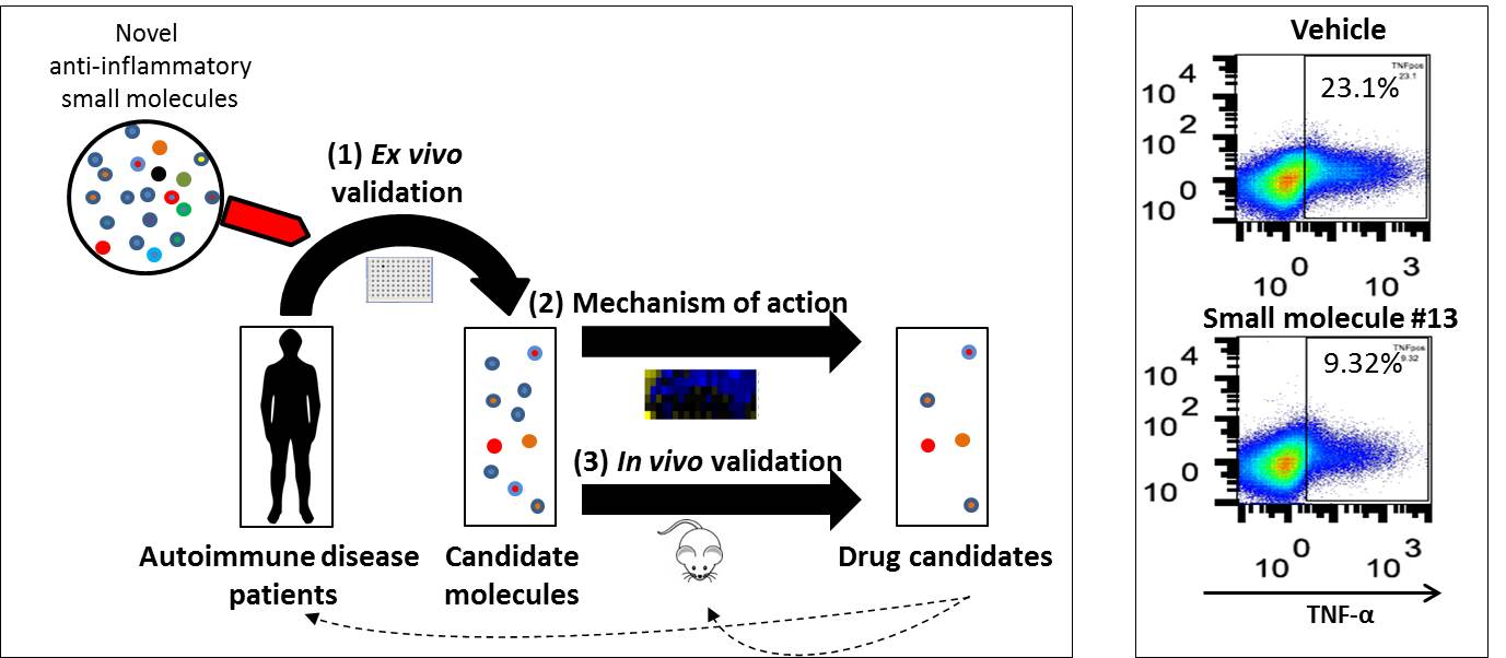 We have extensive experience and expertise in both basic and translational research, as well as in animal models of autoimmunity, and we previously identified a portfolio of novel and repurposed small molecules with previously unknown anti-inflammatory properties. Their advantage with regards to other immunotherapies such as monoclonal antibodies is their small size, which allows them to be administered orally, potentially increasing patient adherence. We are now in the process of validating them ex vivo in Rheumatoid Arthritis and Type 1 Diabetes patients, and in vivo in mouse models, as a previous step to proceeding to preclinical and clinical trials.